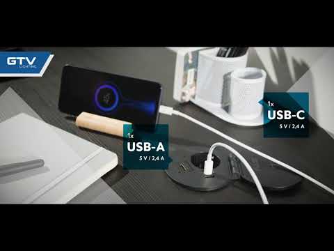 Runde Tischeinbausteckdose mit USB-A, USB-C und Wireless-Charge-Oberfläche sowie austauschbarem Modul (HDMI, LAN, USB oder beliebig)